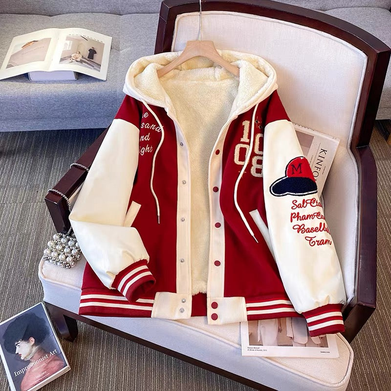 Hooded color matching baseball jacket for women autumn and winter plus velvet thickened new style cotton coat